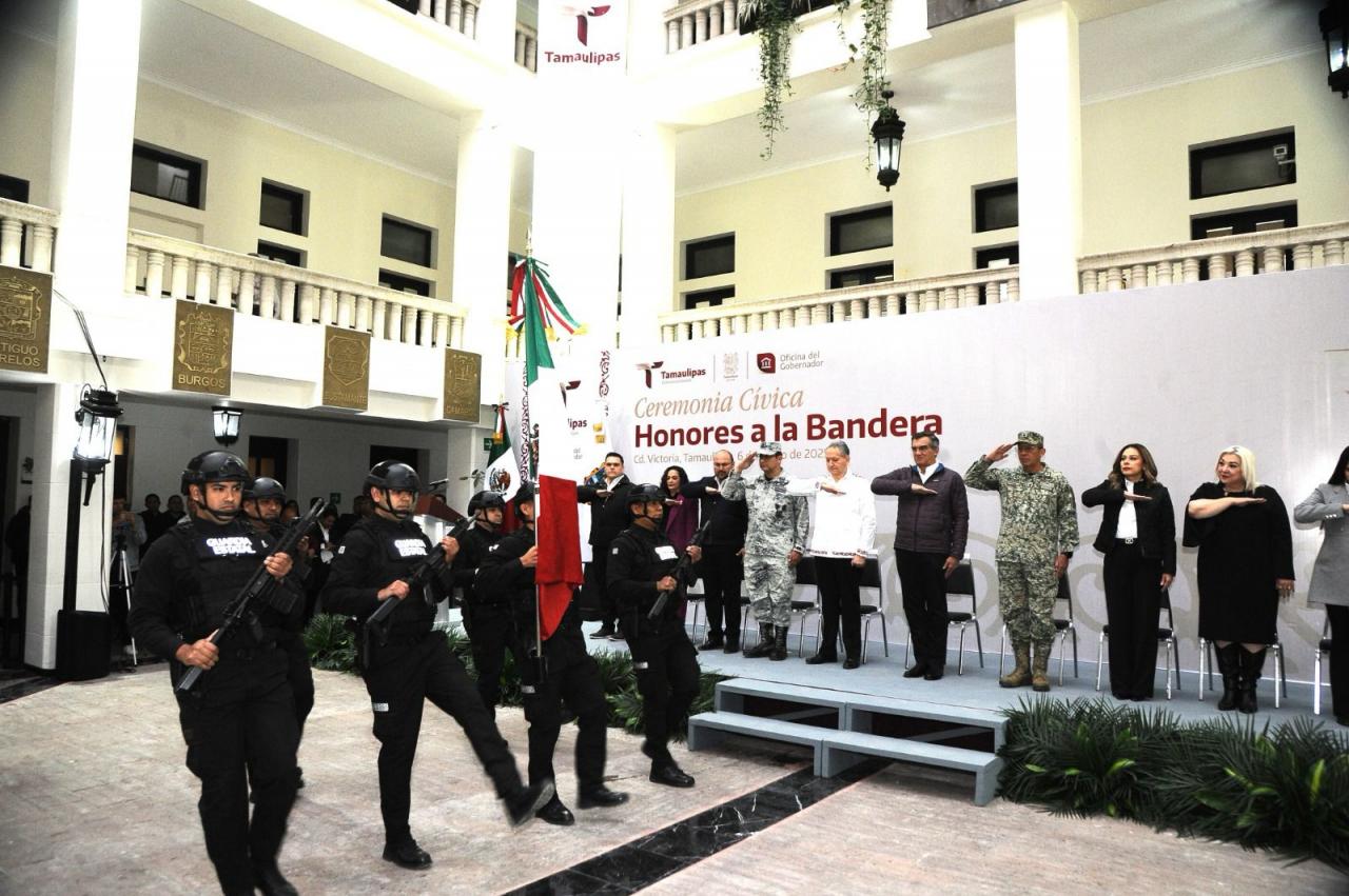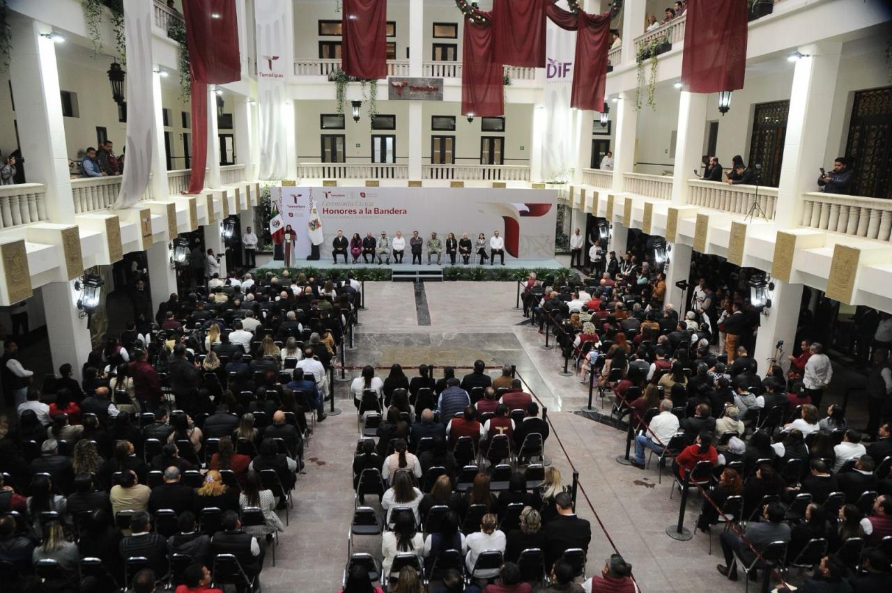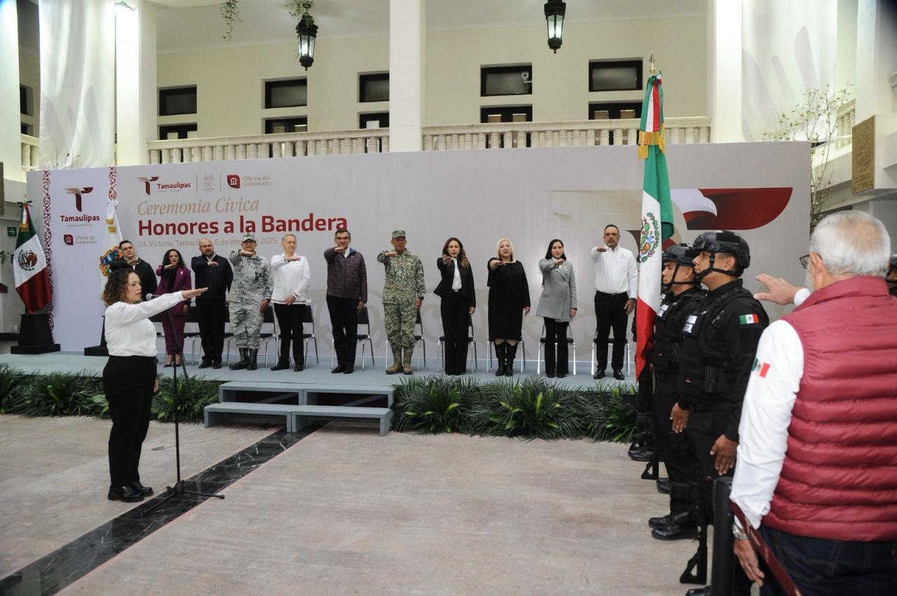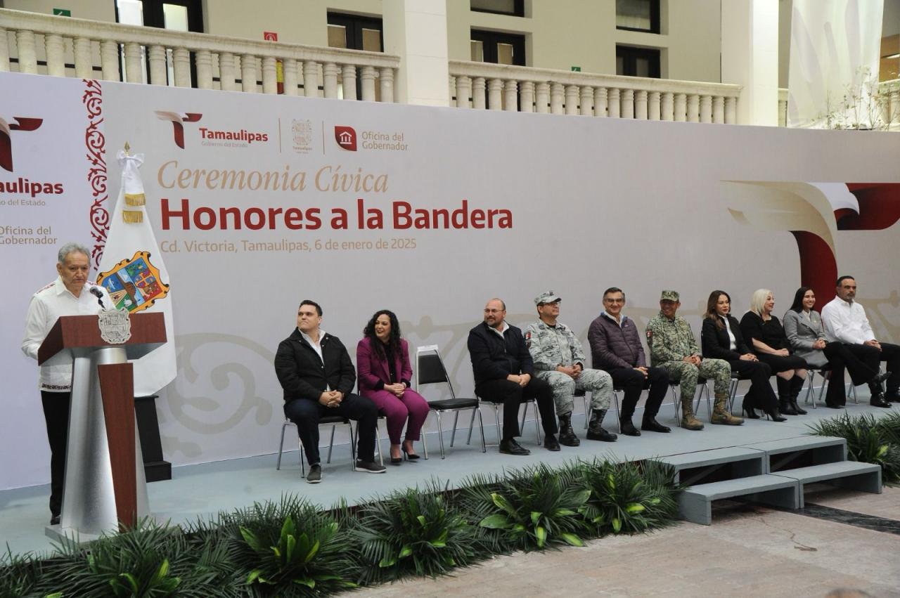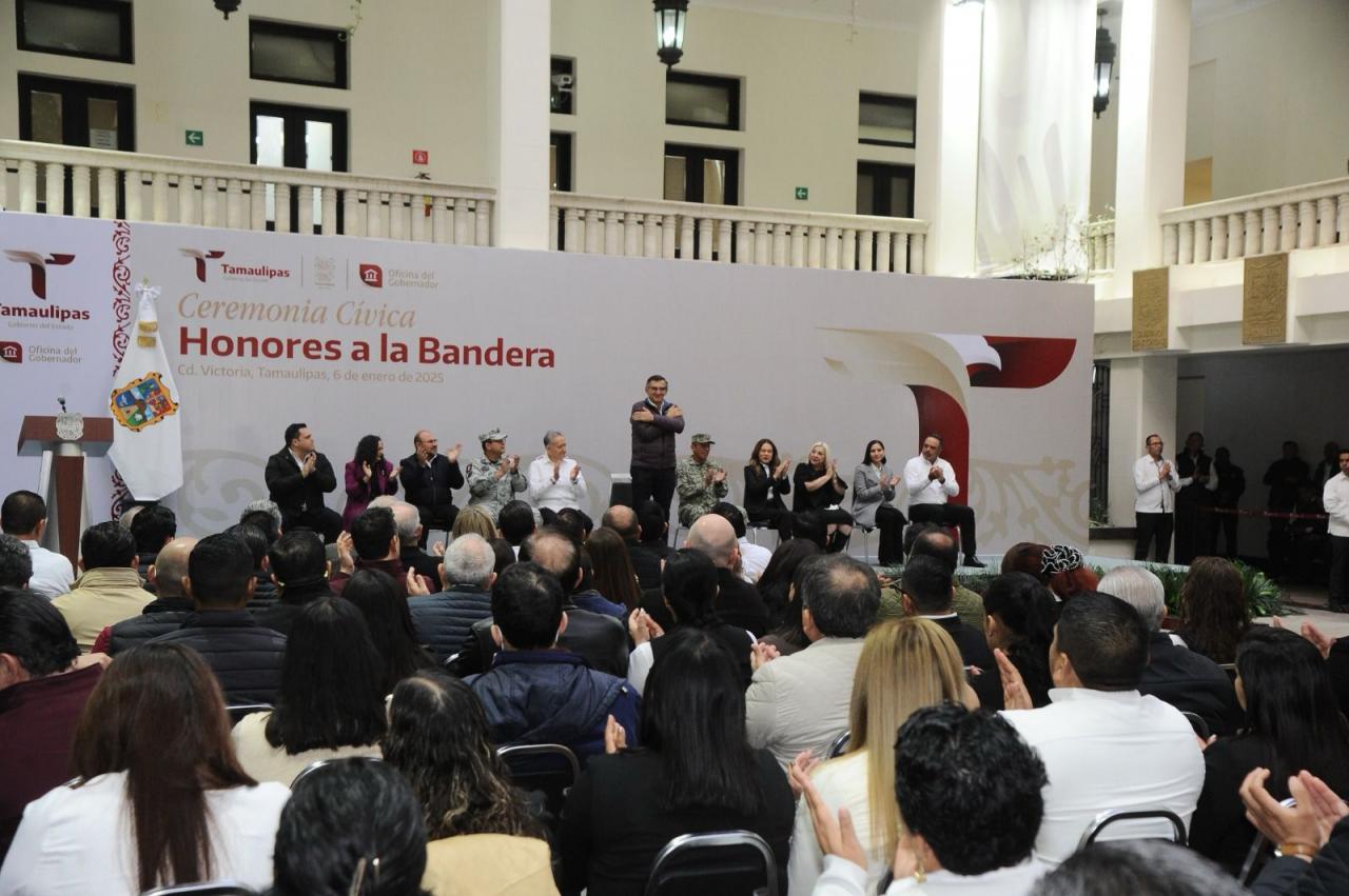 Al presidir la primera ceremonia cívica de honores de 2025, en la explanada central de Palacio de Gobierno, el mandatario tamaulipeco llamó a las y los servidores públicos a trabajar en una agenda humanista, con gran ahínco y dedicación, para seguir transformando a Tamaulipas.