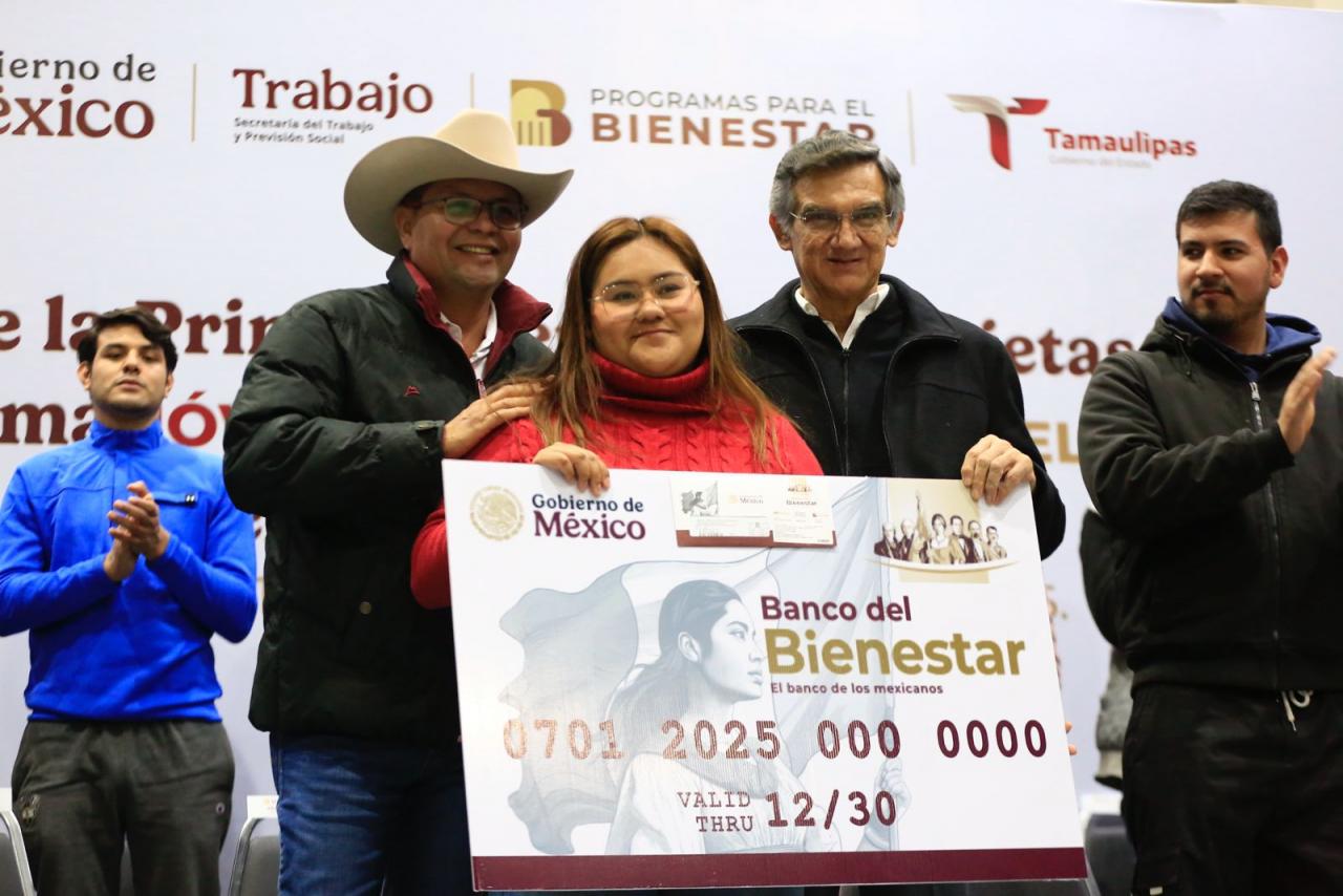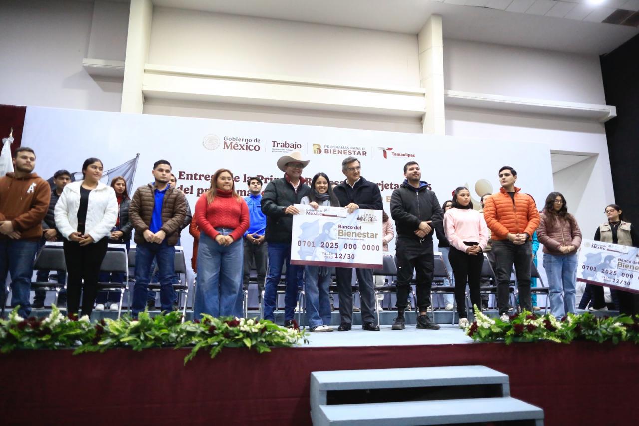 Ciudad Victoria, Tamaulipas.- El gobernador de Tamaulipas, Américo Villarreal Anaya, y el delegado de Bienestar Federal en la entidad, Luis Lauro Reyes Rodríguez, entregaron de manera simbólica la primera remesa de tarjetas 2025 del programa “Jóvenes Construyendo el Futuro”, donde reafirmaron el compromiso para apoyar a la juventud tamaulipeca.