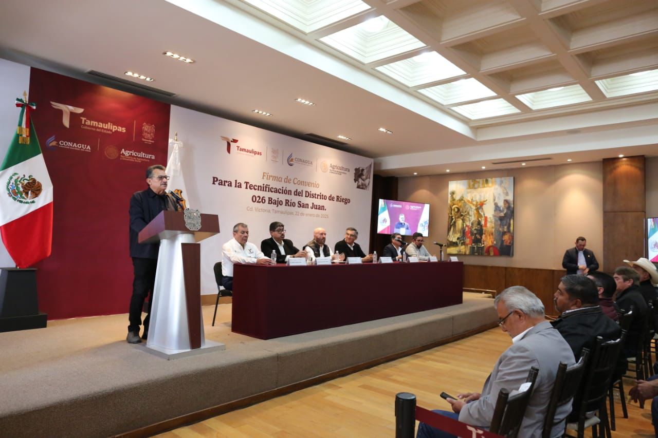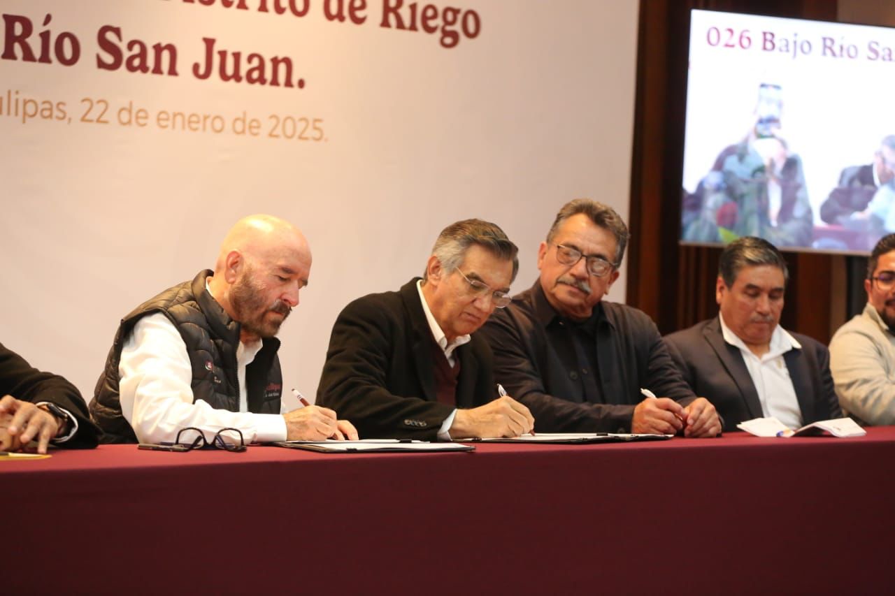 Ciudad Victoria, Tamaulipas.- Como parte del Plan Nacional Hídrico que impulsa la presidenta Claudia Sheinbaum, el gobernador Américo Villarreal Anaya firmó un convenio de colaboración entre la Comisión Nacional del Agua (CONAGUA), el Estado a través de la Secretaría de Recursos Hidráulicos de Tamaulipas, la Secretaría de Agricultura y Desarrollo Rural y los usuarios del Distrito de Riego 026 Bajo Río San Juan, que permitirá tecnificar 200 kilómetros de canales en el fronterizo Distrito de Riego con una inversión de más de 4,100 millones de pesos.