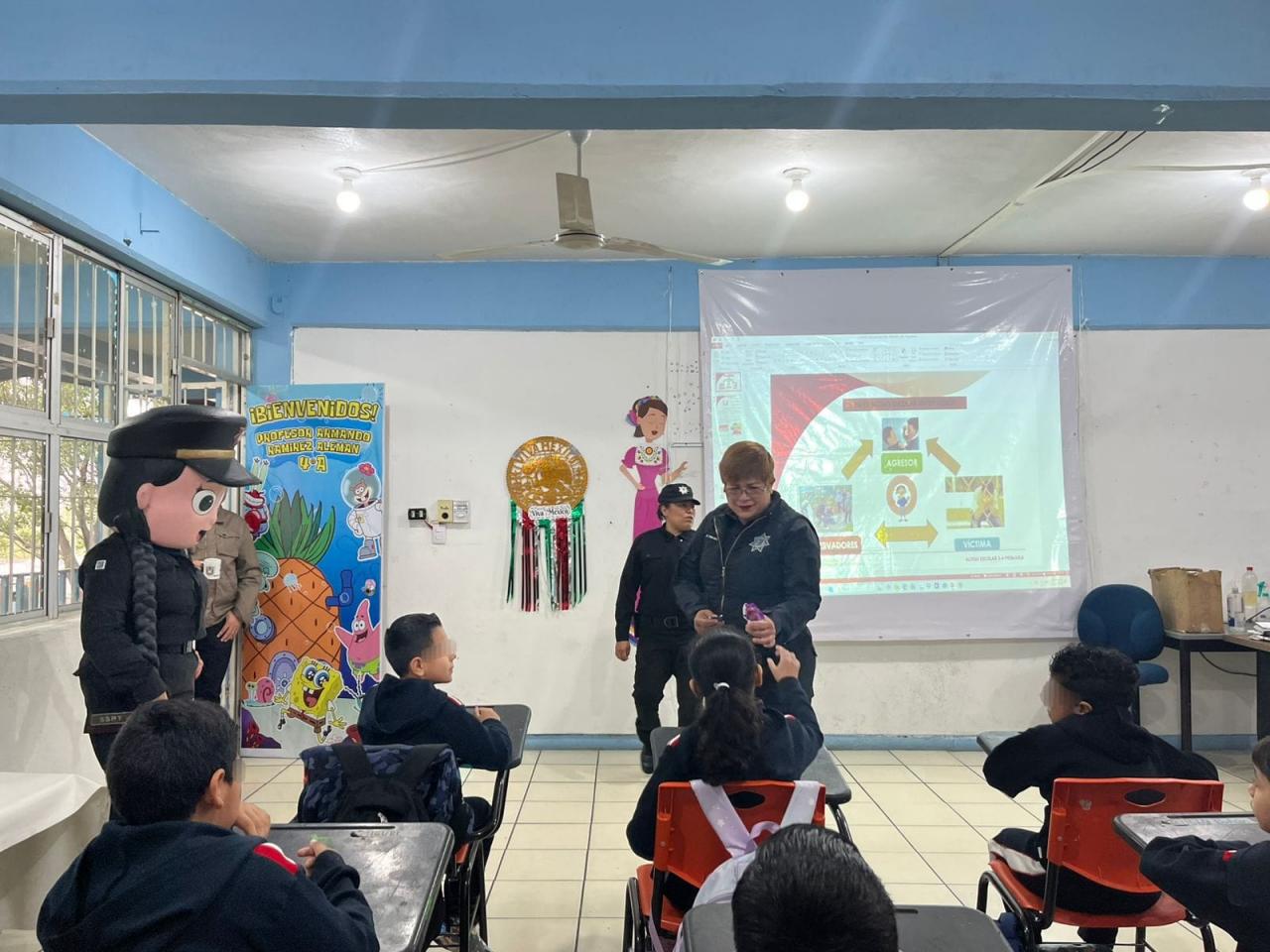 Ciudad Victoria, Tamaulipas.- Con dinámicas, presentaciones y la convivencia con las botargas oficiales, Coronel Justicia y Capitana Honradez, estudiantes de la Escuela Primaria María Isabel Mata Alvarado conocieron las diversas modalidades y cómo actuar ante casos de violencia escolar gracias a la información proporcionada por el personal de la Guardia Estatal de Género.