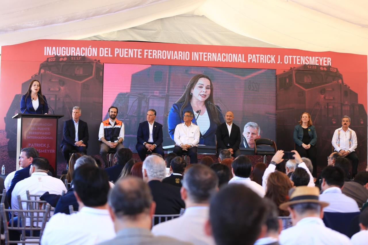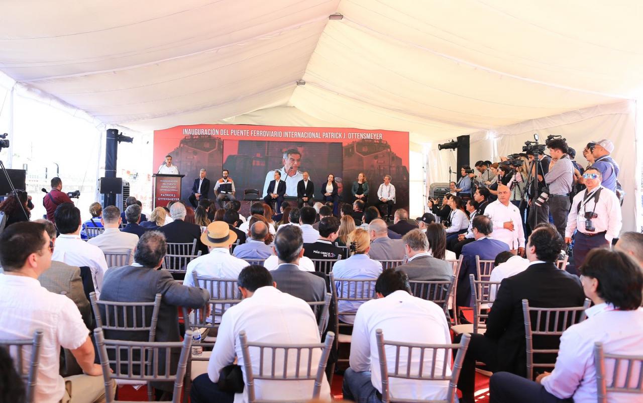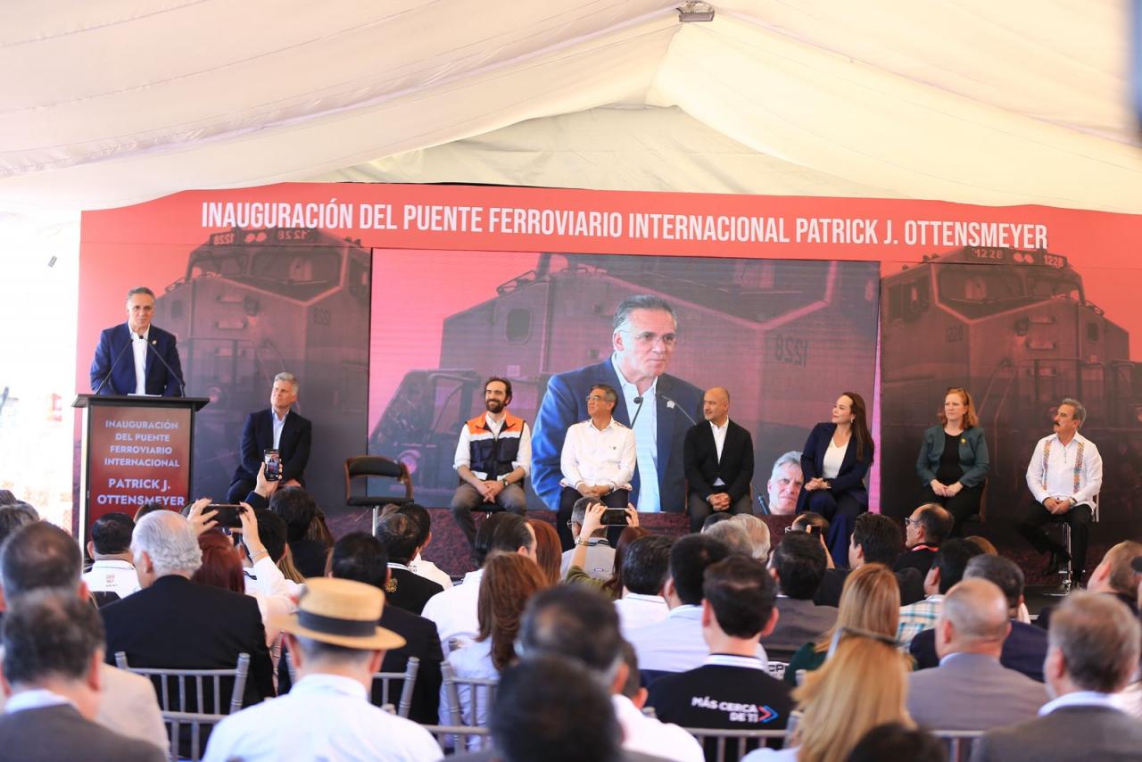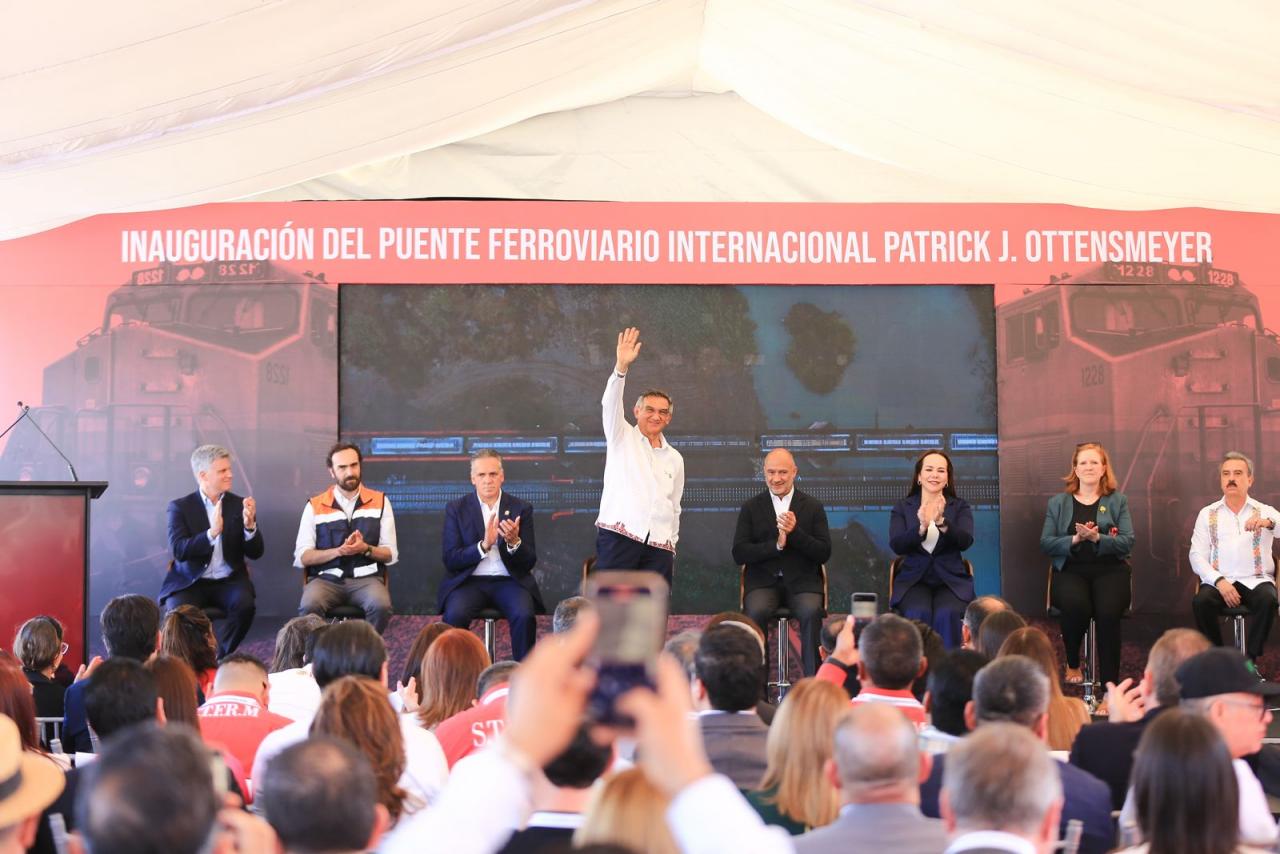 Nuevo Laredo, Tamaulipas. – El gobernador Américo Villarreal Anaya y el secretario de Infraestructura, Comunicaciones y Transportes, Jesús Antonio Esteva Medina, junto con directivos de la empresa Canadian Pacific Kansas City, inauguraron en esta ciudad el puente ferroviario internacional Patrick J. Ottensmeyer, que permitirá duplicar el intercambio comercial entre el corazón industrial de México con Estados Unidos y Canadá.