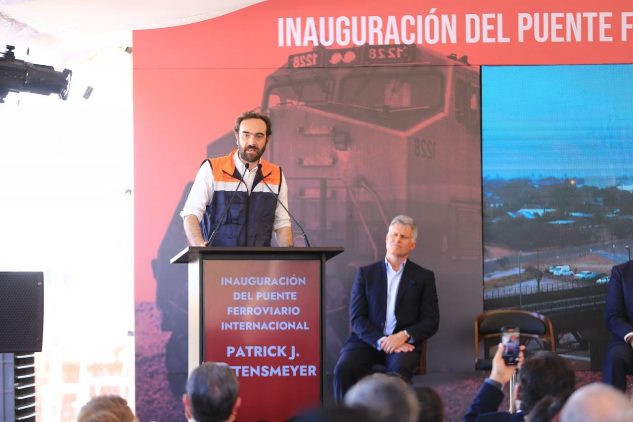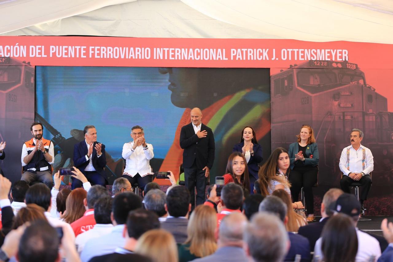 A nombre de Canadian Pacific Kansas City, el presidente de la empresa en México, Oscar del Cueto Cuevas, explicó que este nuevo puente ferroviario lleva el nombre de Patrick J. Ottensmeyer, quien falleció en julio del 2024, en memoria de su aportación a la empresa, ayudando a construir la industria ferroviaria.