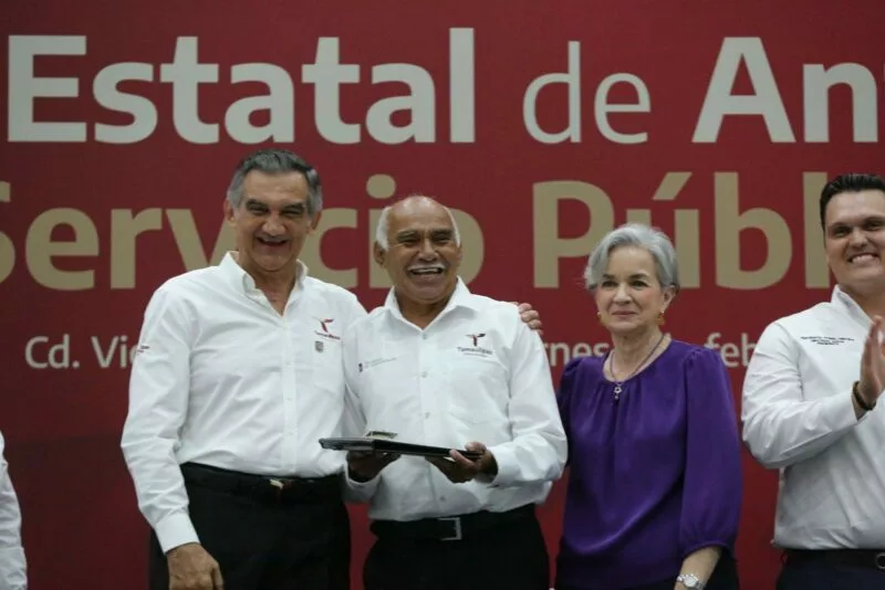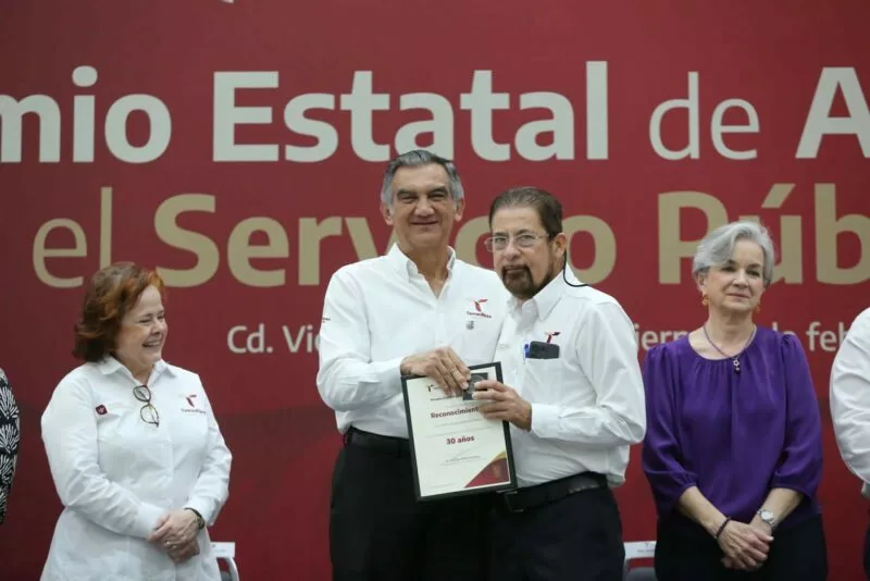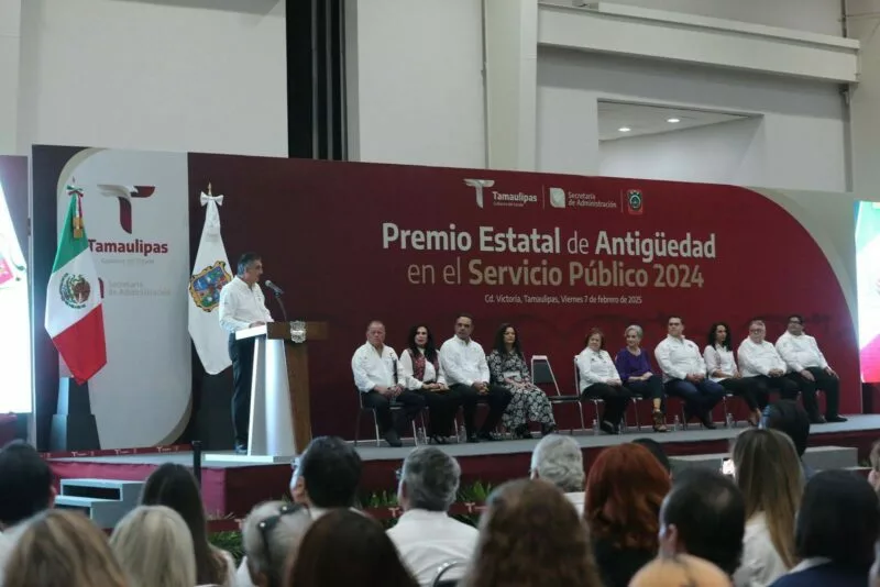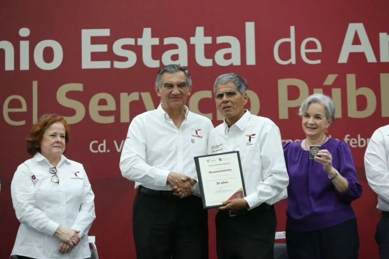Luego del efusivo recibimiento y los gritos de ¡gobernador!, ¡gobernador! por parte de los asistentes, Américo Villarreal entregó los premios de antigüedad, incluyendo a cuatro trabajadores y trabajadores con 50 años de servicio: María de los Remedios Valles Fuentes (Secretaría de Finanzas); Ramiro Huerta Rodríguez (Secretaría de Obras Públicas); Marco Antonio Valdez Juárez (Secretaría de Administración) y Blanca Guadalupe Valles Rodríguez (Secretaría de Administración).
