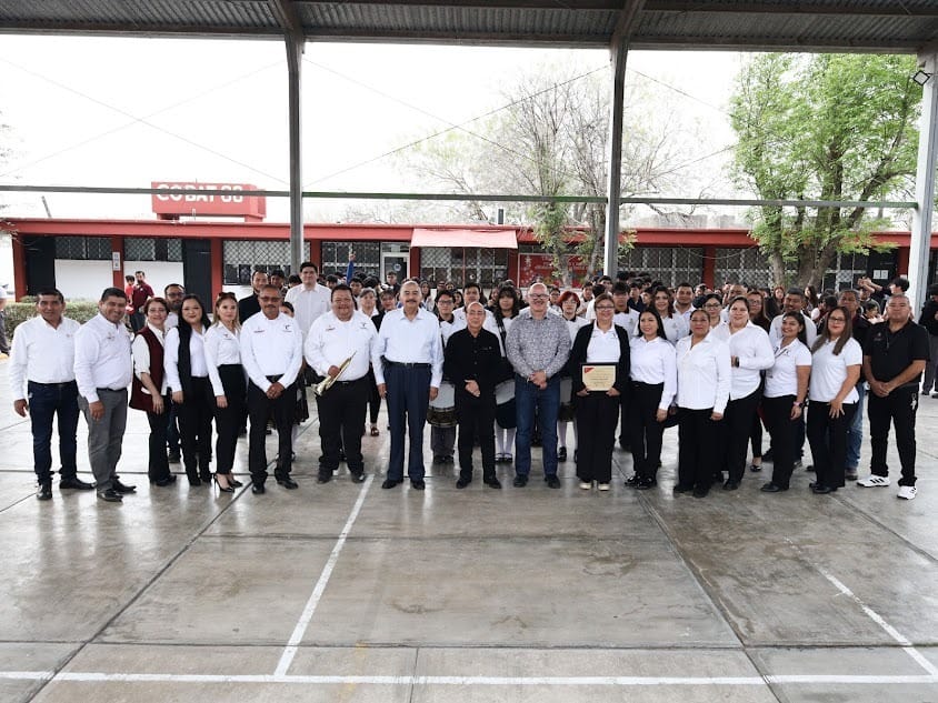 En ceremonia de honores a la bandera que incluyó la entrega de instrumentos para banda de guerra y reconocimientos al personal por su trayectoria laboral, el titular del COBAT resaltó la dedicación de la planta docente de la institución y el compromiso que tienen con la formación de las y los jóvenes, al contar con 64 centros educativos y atender a más de 18 mil 700 estudiantes en todo Tamaulipas.