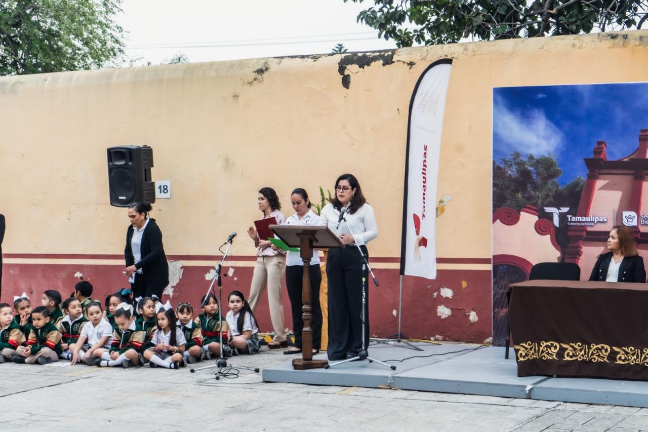 Se contó con la participación de los alumnos de la mencionada escuela primaria y de la Banda de Guerra de la Secundaria Gral. No. 1, quienes realizaron los honores a la bandera.