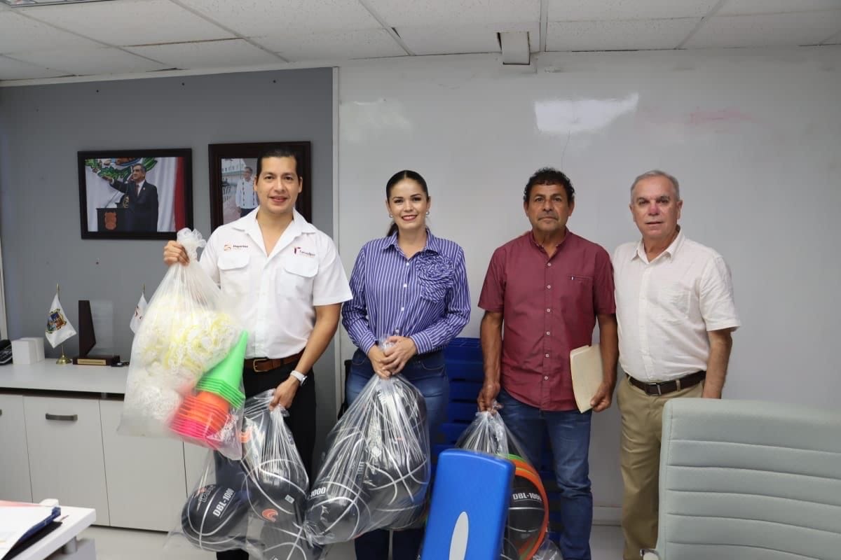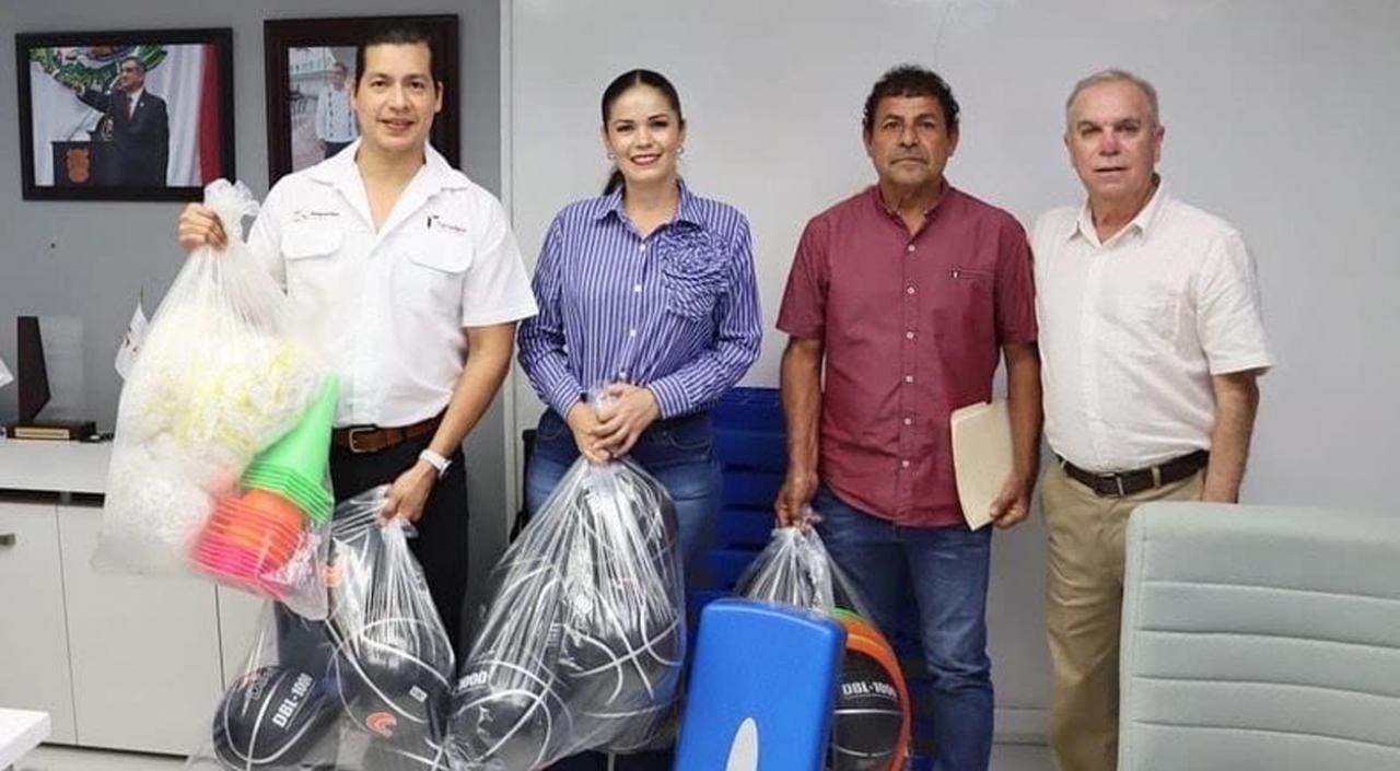 En la entrega del material estuvieron presentes Santos Lozano Cedillo, director de Desarrollo del Deporte, y Lidio Saldívar, director de Deportes de Jiménez.