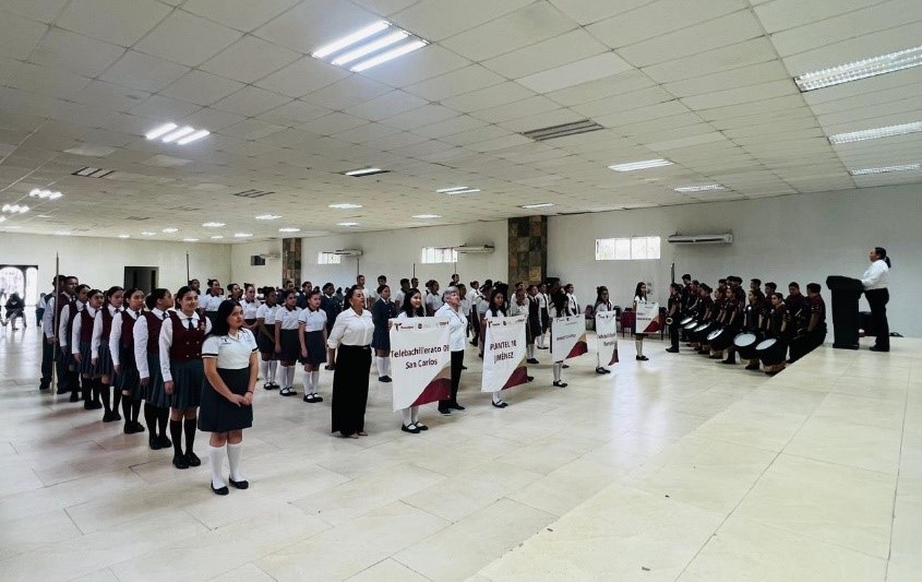 Jiménez, Tamaulipas.– Con el objetivo de fomentar entre las y los estudiantes la identidad nacional, el respeto por los símbolos patrios y promover su participación en actividades de carácter cívico, el Colegio de Bachilleres del Estado de Tamaulipas (COBAT) llevó a cabo, en sus etapas regionales, el Concurso Estatal de Escoltas y Banda de Guerra 2025.