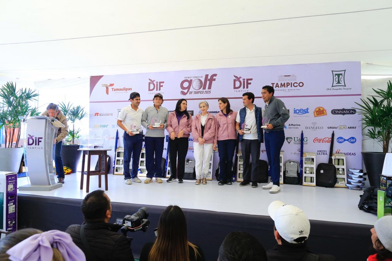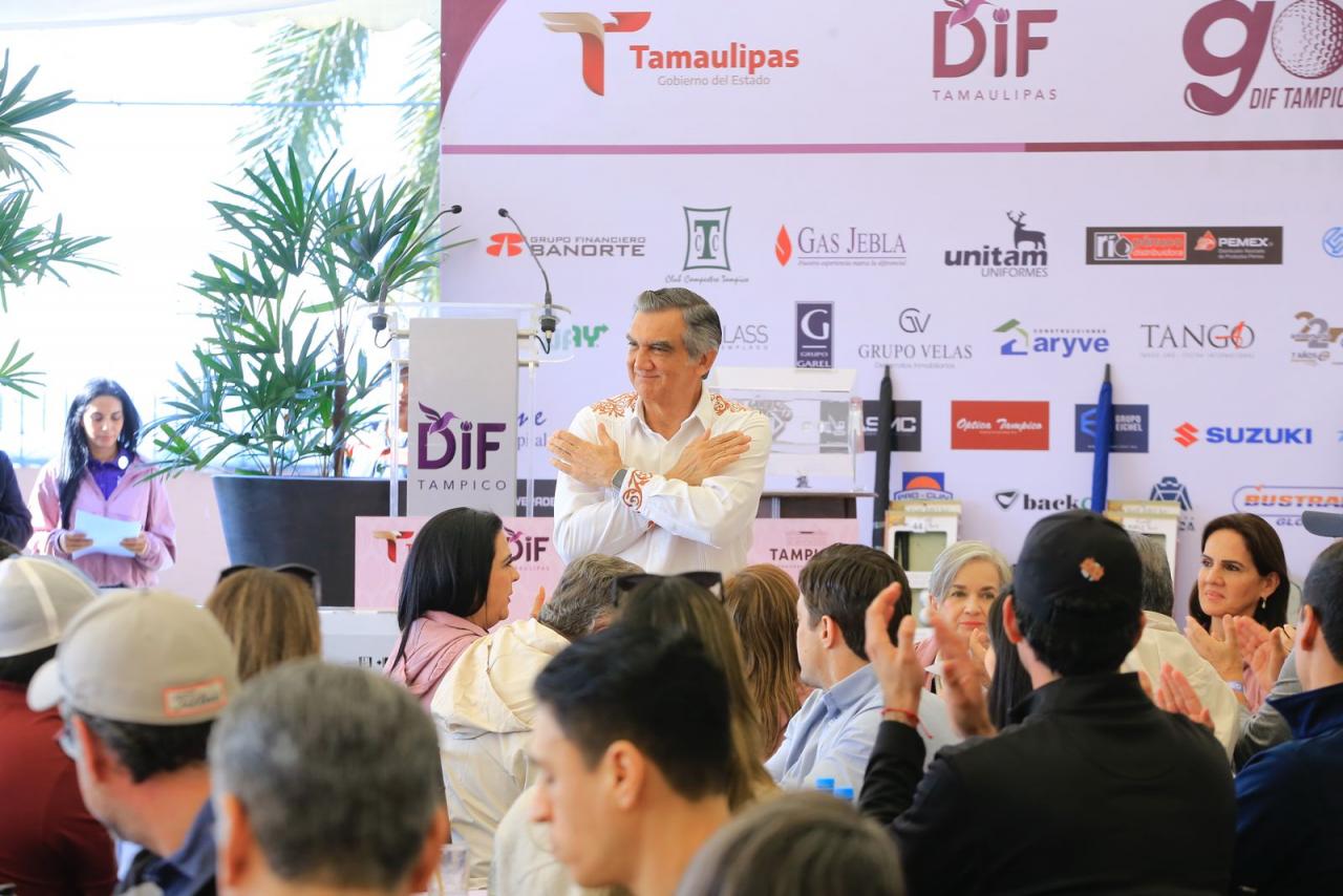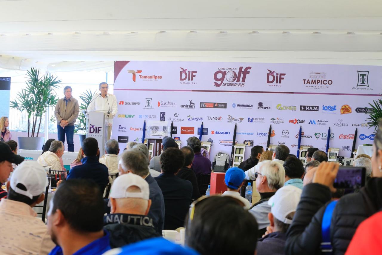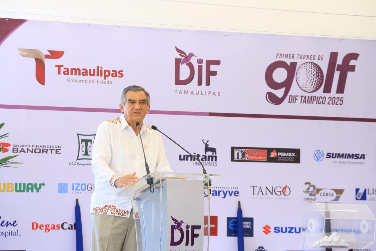 Al encabezar la ceremonia de premiación del Primer Torneo de Golf DIF Tampico 2025, acompañado por la presidenta del DIF Tamaulipas, doctora María de Villarreal, y por la presidenta municipal Mónica Villarreal Anaya, el gobernador destacó que este tipo de actividades y el respaldo económico que brindan es un ejemplo de cómo se puede seguir construyendo un mejor futuro a través de una sociedad participativa y colaborativa.