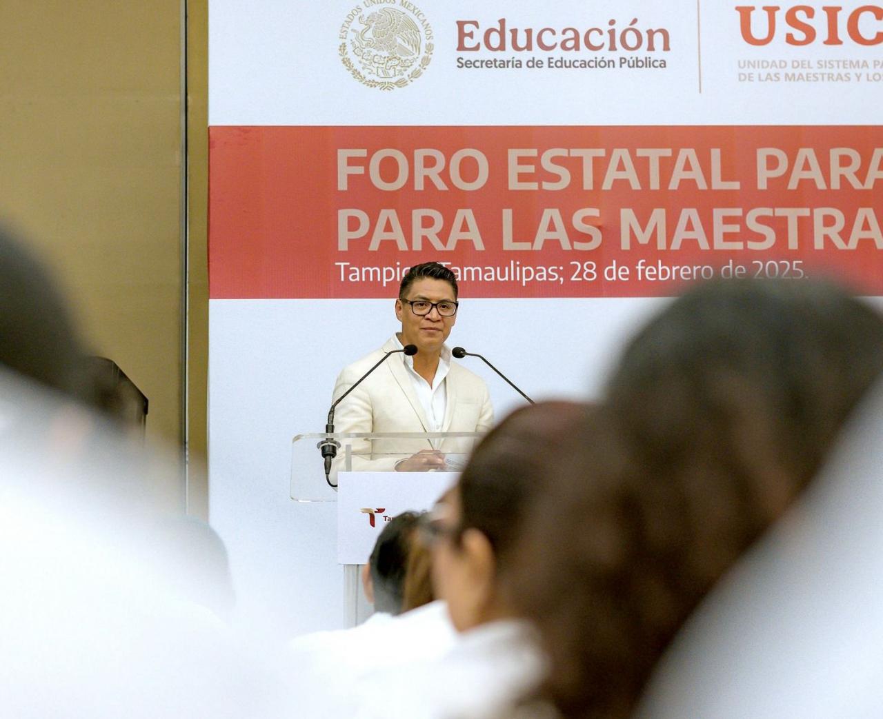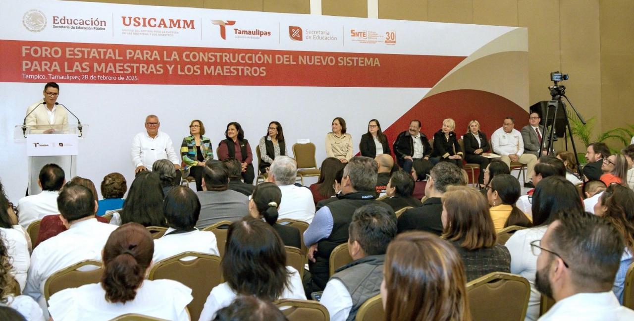 Tampico, Tamaulipas.- En el marco del Foro Estatal para la Construcción del Nuevo Sistema para las Maestras y los Maestros realizado en el municipio de Tampico, el coordinador de asuntos jurídicos de la USICAMM del Gobierno Federal, Miguel Ángel Guerrero López, reafirmó el compromiso de la presidenta de México, Claudia Sheinbaum Pardo con las maestras y maestros de México y de Tamaulipas.