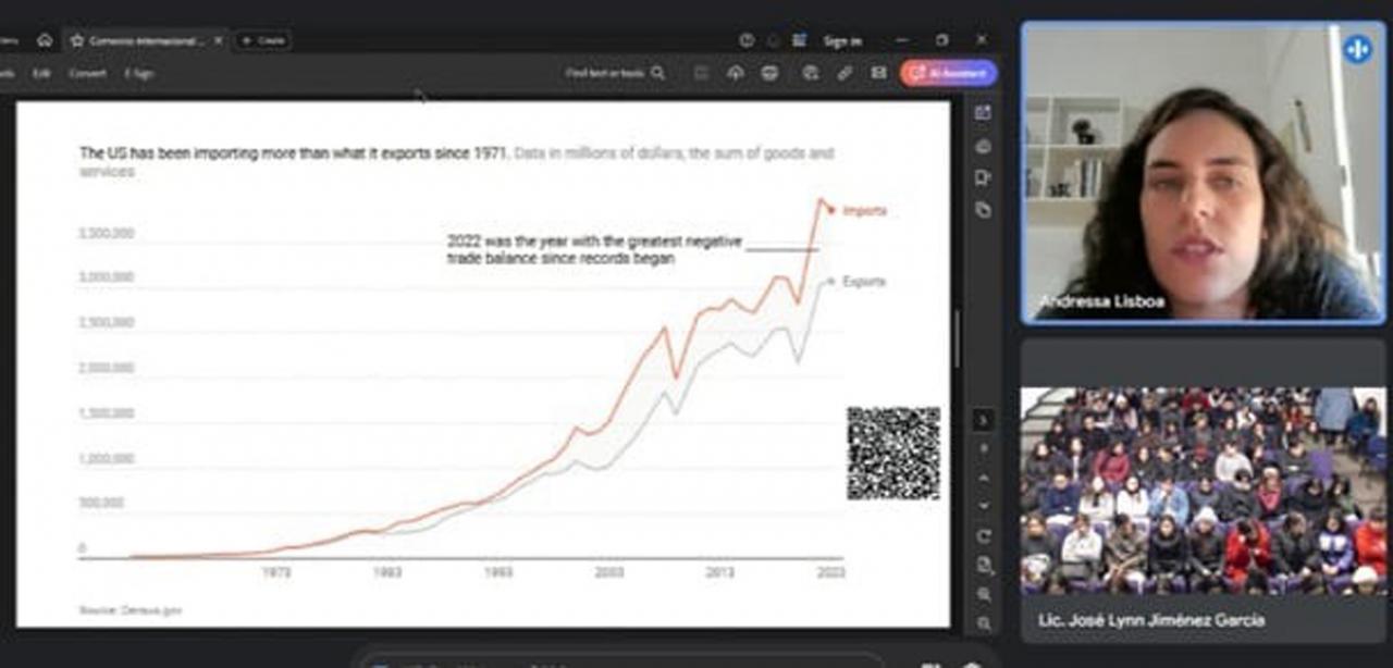 Durante la ponencia, dirigida a estudiantes del programa académico de Licenciatura en Comercio Internacional y Aduanas BIS (LCIA BIS), se abordaron temas relacionados con las implicaciones derivadas de las decisiones del gobierno de Donald Trump de imponer aranceles, además de la competencia comercial entre China y Estados Unidos, que básicamente es la imposición de tarifas arancelarias.