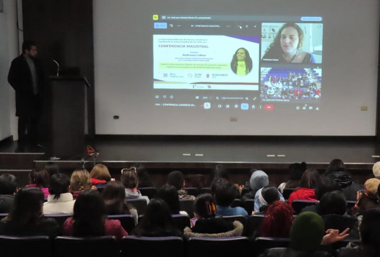 Ciudad Victoria, Tamaulipas.– La Universidad Politécnica de Victoria (UPV), a través de la Coordinación de Internacionalización, organizó la conferencia “Comercio Internacional en tiempos de aumento de aranceles: impacto en la economía y en la movilidad latinoamericana”, impartida por la investigadora Andressa Lisboa, de la Universidad Federal de Bahía en Brasil.