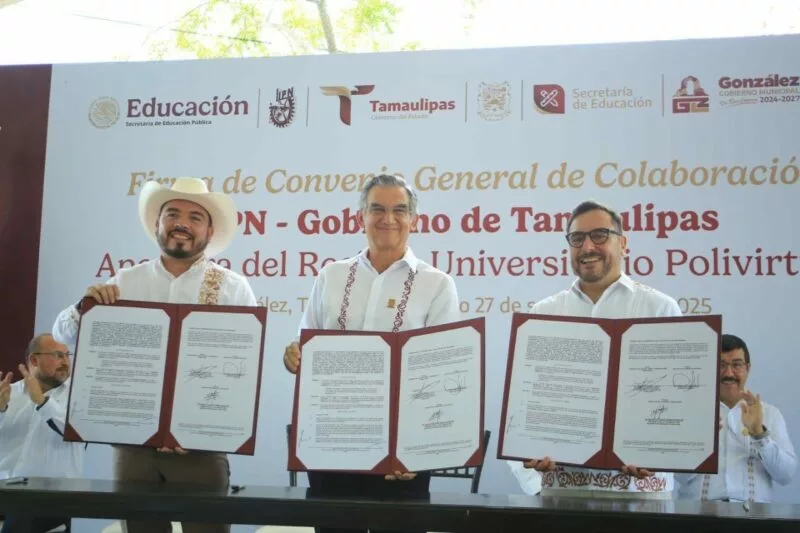 González, Tamaulipas. – El gobernador Américo Villarreal Anaya firmó el convenio de colaboración con el Instituto Politécnico Nacional e inauguró el Recinto Universitario Polivirtual, una nueva plataforma académica con la calidad y la excelencia educativa que distingue a esta prestigiada institución y que, por primera vez, se pone en marcha en todo el país.